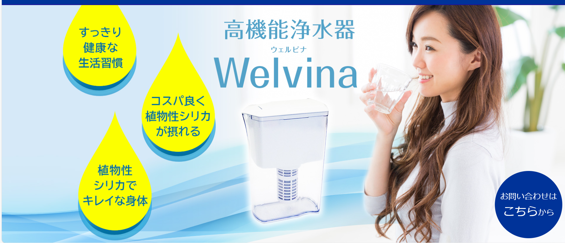 Welvinaは、国産もみ殻活性炭を使った高性能フィルターにより、浄水とシリカ補給を同時に実現する唯一の浄水器です。