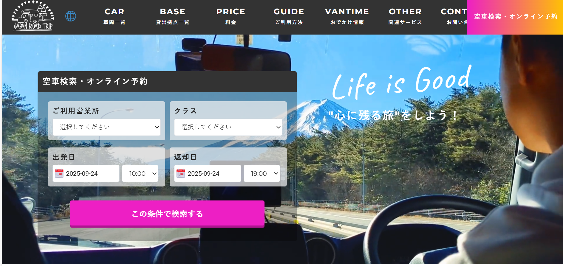 JAPAN ROAD TRIP(ジャパンロードトリップ)は、北海道〜九州の全国拠点で借りられる国内最大級のキャンピングカーレンタル。