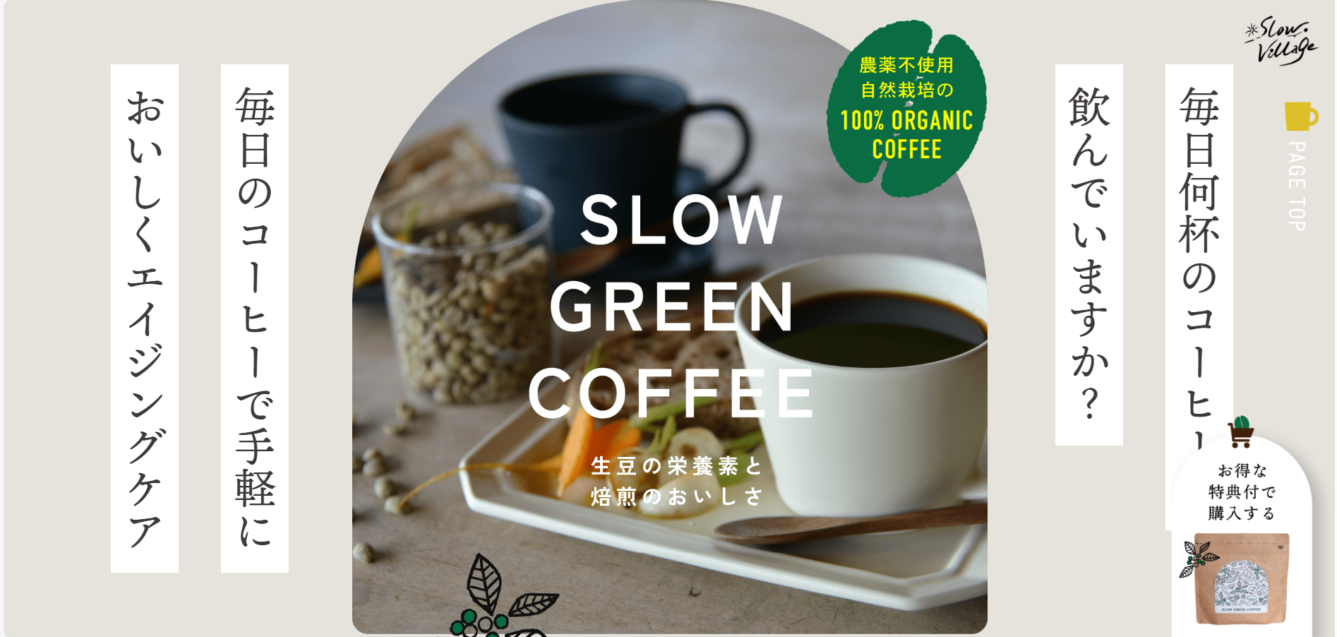 SLOW GREEN COFFEEは、毎日のコーヒー時間を手軽でおいしい“年齢に応じたケア”へとつなげたい方に向けたライフスタイルコーヒーです。