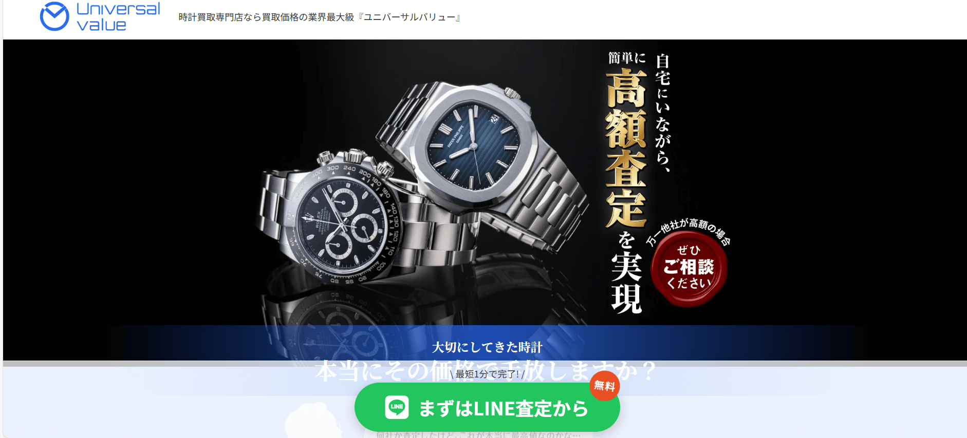 ユニバーサルバリューは、時計の価値を正しく見極めることにこだわる買取サービスです。相場の変動や個体差、付属品の有無まで丁寧に確認し、高価買取を目指す査定運用で一人ひとりの時計に向き合います。事前見積・手数料・送料は無料。店頭・出張・宅配など、ご都合に合わせて買取方法を選べます。まずは無料査定で、今の価値を確認しましょう。
