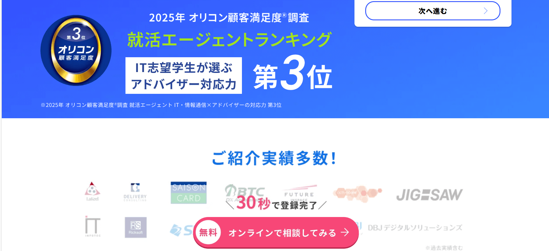- IT・Web業界志望の学生に特化した新卒紹介。志望ドメイン(SaaS・SI・ゲーム・広告Techなど)別に対策。