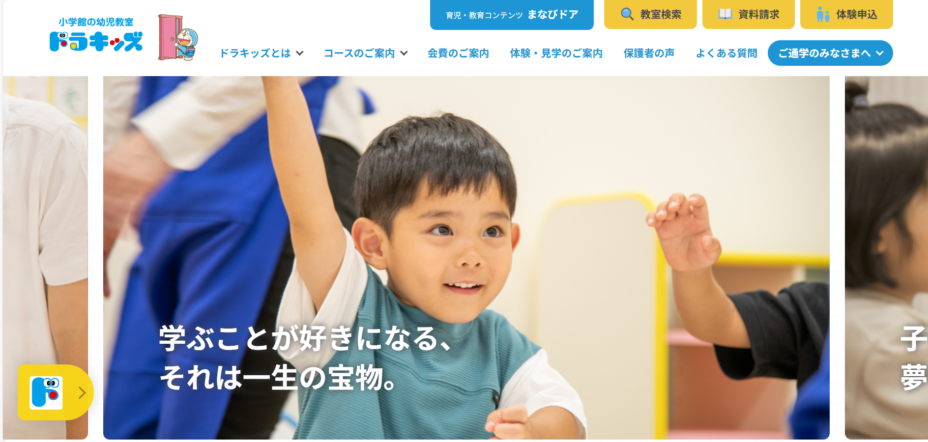 ドラキッズは、小学館グループが運営する0歳から小学6年生までを対象とした幼児教室です。「遊びながら学ぶ」ことを基本に、ことば・数・自然・表現・思考・社会性といった6つの分野を総合的に育むカリキュラムを提供しています。