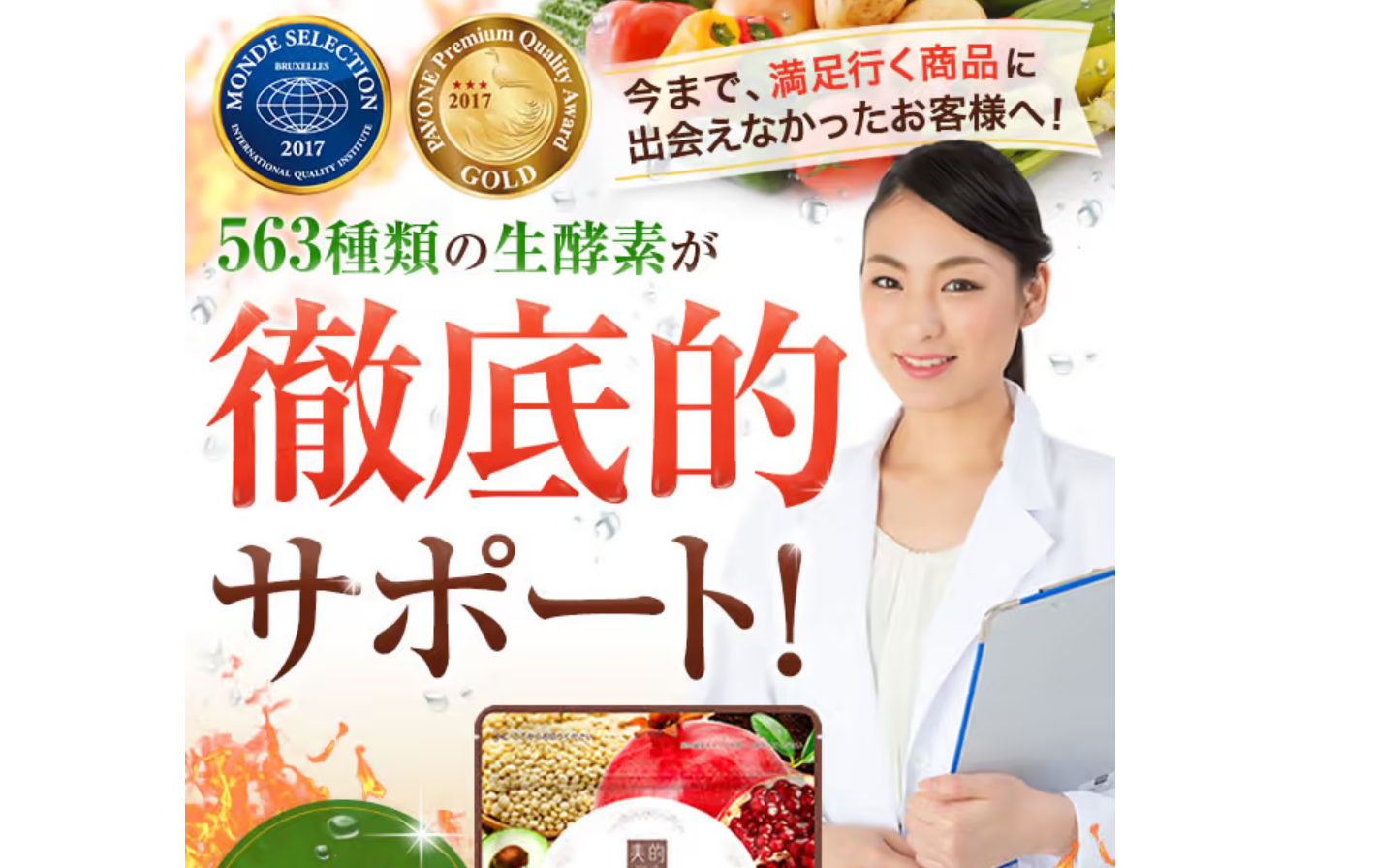 563種類の植物・果物・野菜・海藻などを凝縮した生酵素サプリで、美容も健康もよくばりにサポートします。