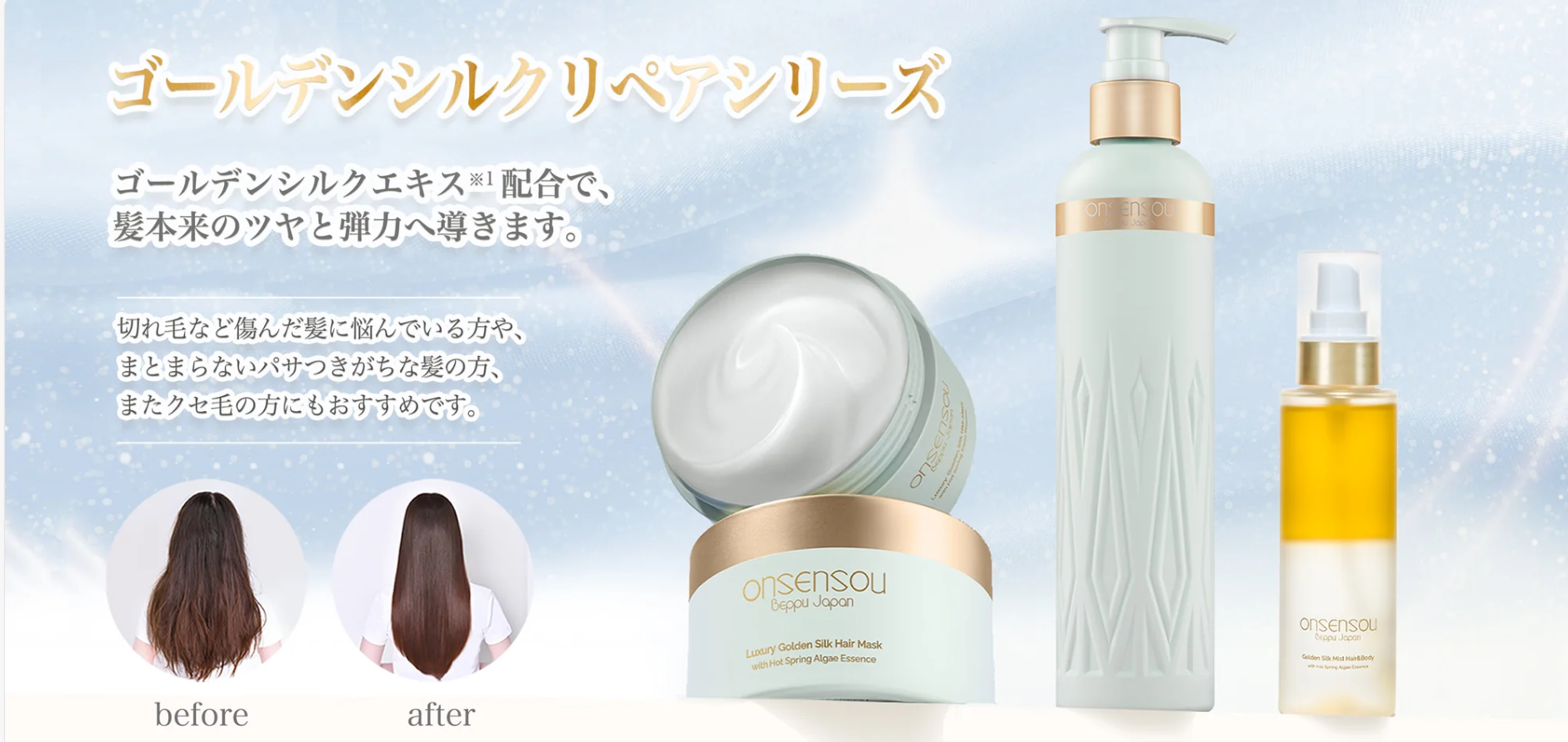 ONSENSOUは日本の温泉文化に学び温泉の恵みを日々のケアへつなぐ日本発のパーソナルケアブランドです。独自の温泉藻エキスを核に自然由来成分と特許技術を組み合わせ低刺激と高機能を両立します。中でもゴールデンシルクリペアは頭皮と髪のための集中補修ラインです。清潔感とやさしさと凛とした美しさを日々の習慣として育てます。