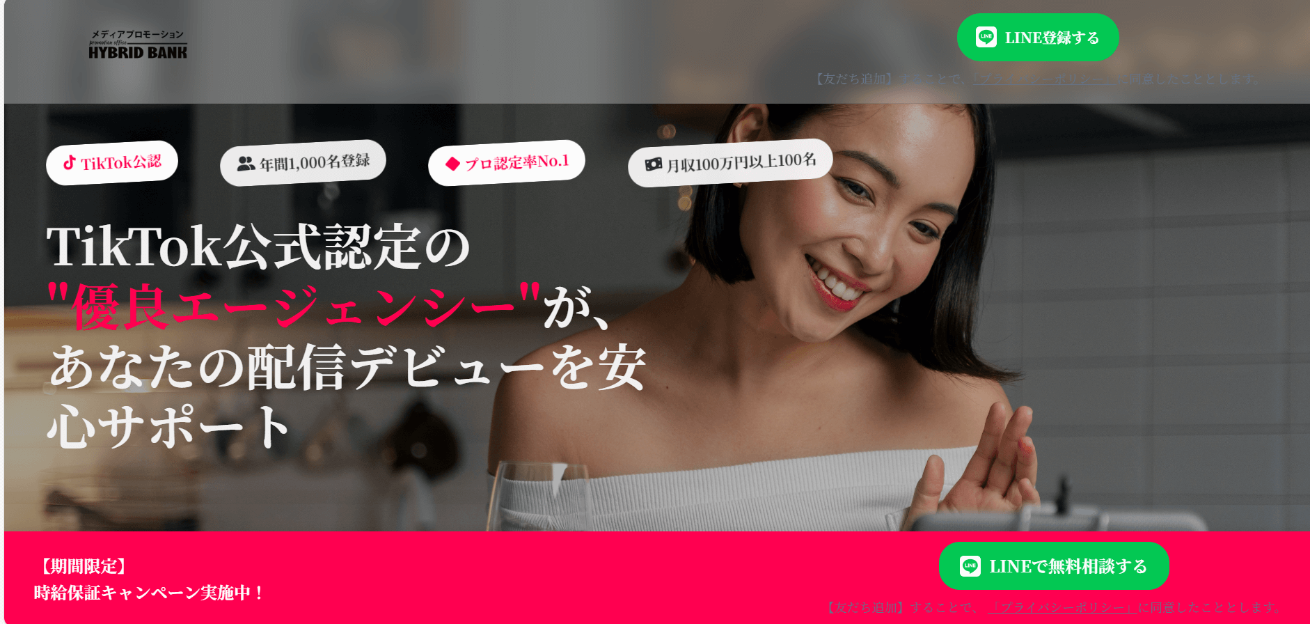 アルバイトより自由に、好きな時間に、あなたの「好き」で収入をつくる。ハイブリッドバンクは、初心者でもスマホ1台でライバーデビューできるライバー支援サービスです。17LIVEやTikTok LIVEなど人気配信アプリに強く、公式LINEから応募→無料相談→最短即日デビューまで並走します。