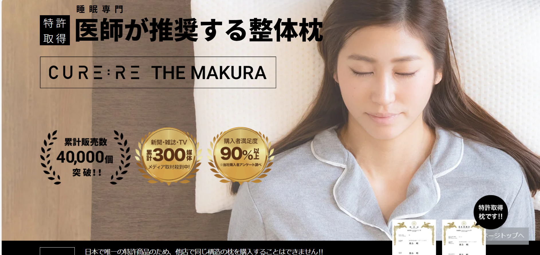 Cure:Re(キュアレ)の特許取得整体枕です。体の専門家が考案した枕として密かに人気が広がり、