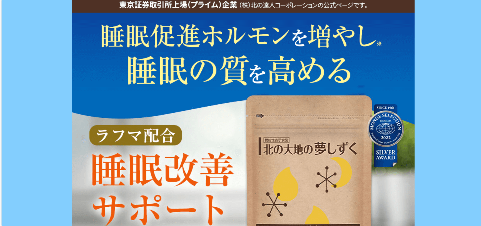 『北の大地の夢しずく』は、眠りの質を見直したいと考える方の毎日に寄り添う睡眠改善サポートサプリメントです。