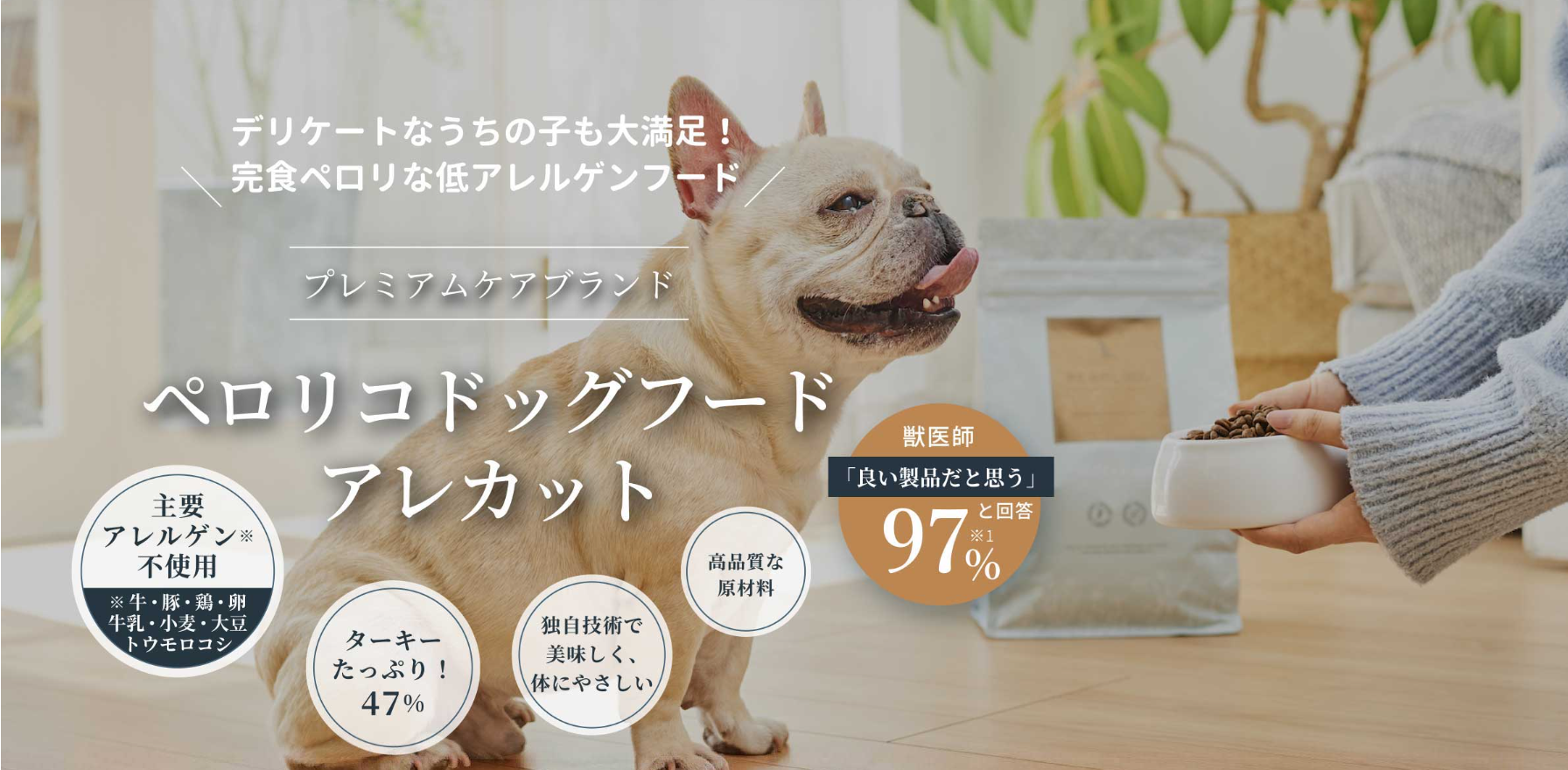 ペロリコドッグフード アレカットは、そんな想いを持つ飼い主さんが、愛犬の毎日のごはんと向き合う際に、安心して検討できるドッグフードです。